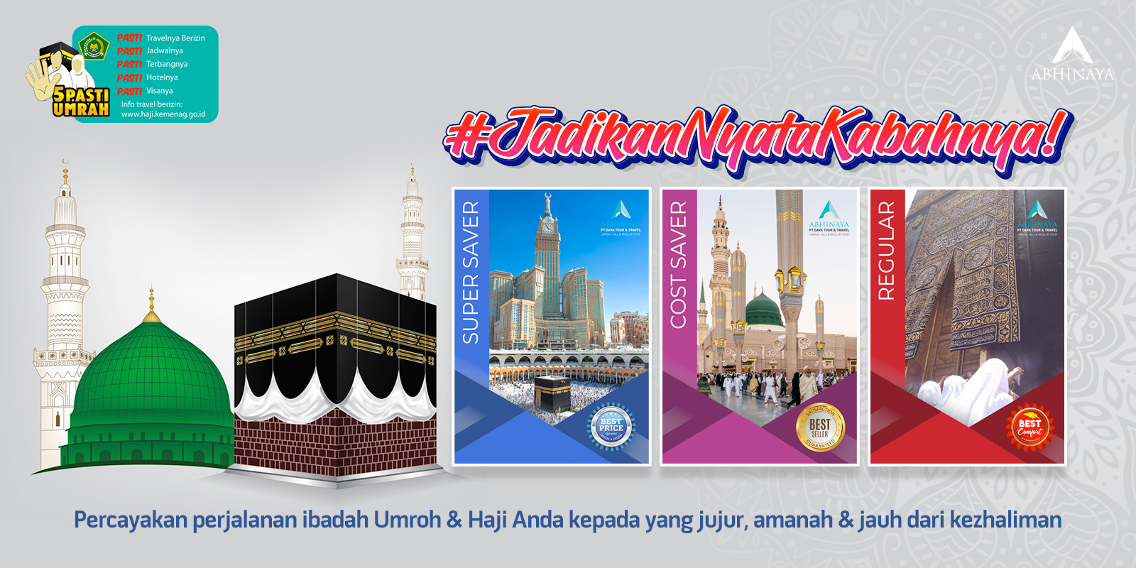 Bagi kami melayani tamu-tamu Allah dengan sebaik baiknya adalah sebagai bentuk ibadah kami, Insya Allah “ABHINAYA” selalu Amanah dan berkomitmen dalam memberikan pelayanan yang terbaik kepada setiap pelanggan kami. Marilah kita memenuhi undangan ke Baitullah dengan memilih mitra perjalanan yang amanah dan terbaik. Insya Allah perjalanan akan mudah dan sempurna.